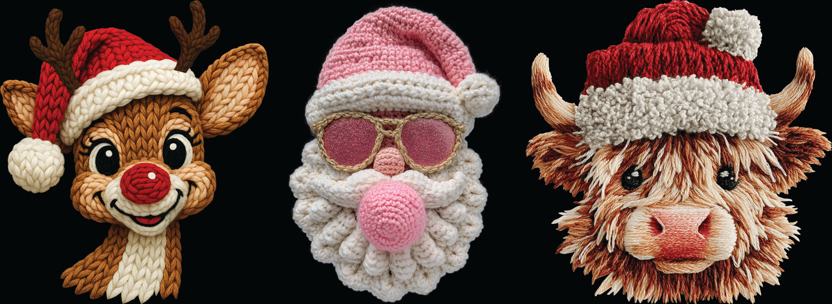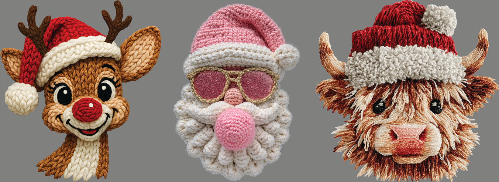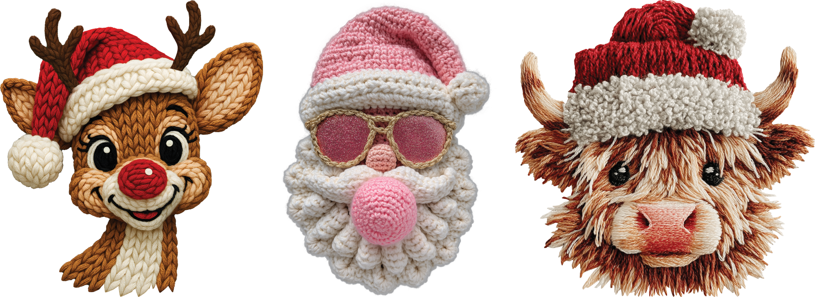 Add a soft, handmade touch to your holiday creations with this Holiday Crochet Trio DTF Transfer! This adorable mini set includes a crochet-style Reindeer, Santa, and Highland Cow, each about 2 inches tall. Perfect for trucker hats, left-chest prints, sleeves, stockings, tote corners, and boutique gift items.