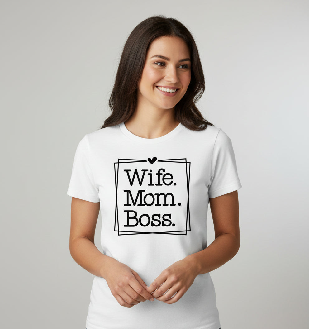 Wife Mom Boss DTF Transfer – 10.6" wide design perfect for apparel, tote bags, and promotional items. Features vibrant, festive artwork in elegant script. Available in Black or White ink to match your garment base.