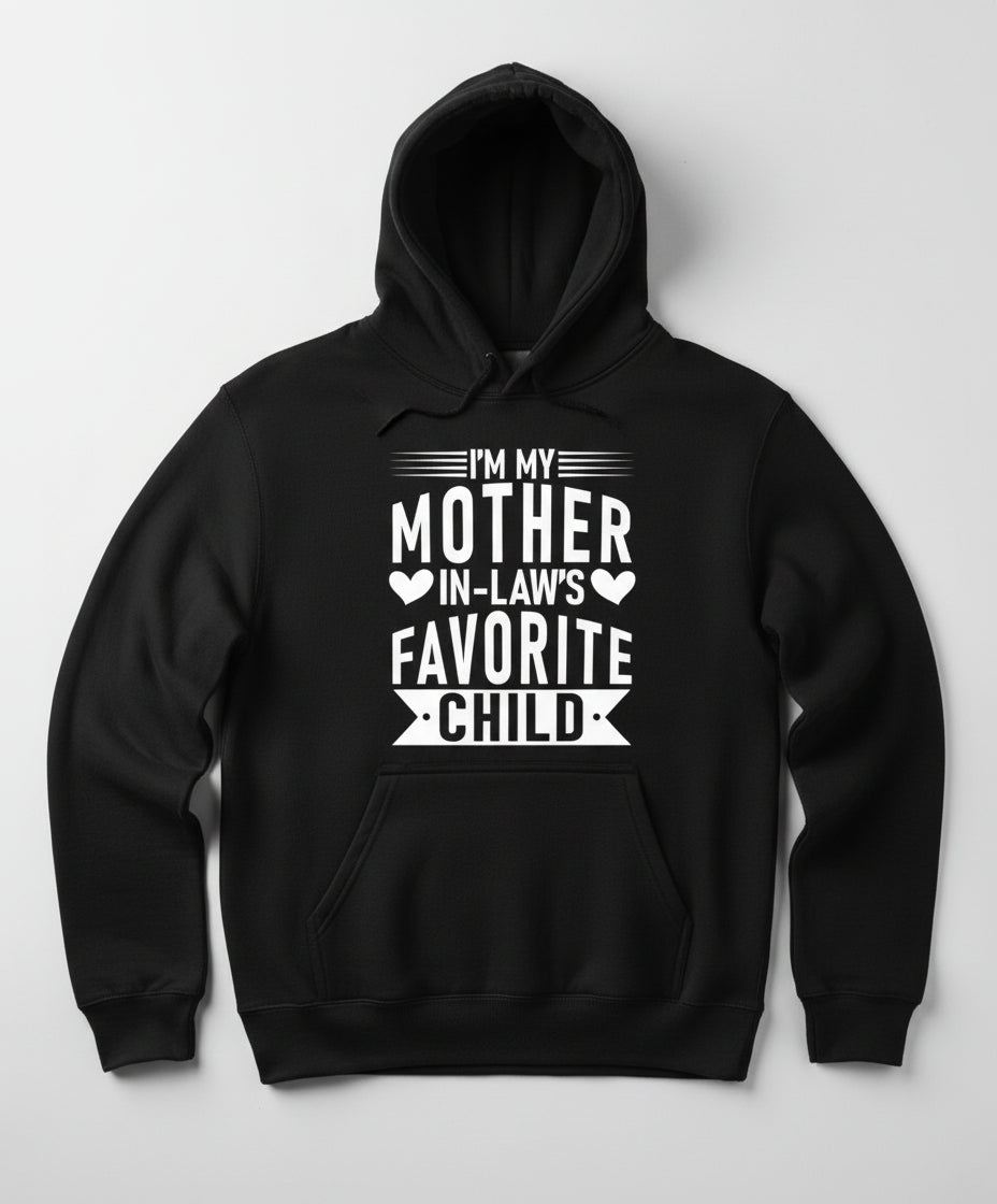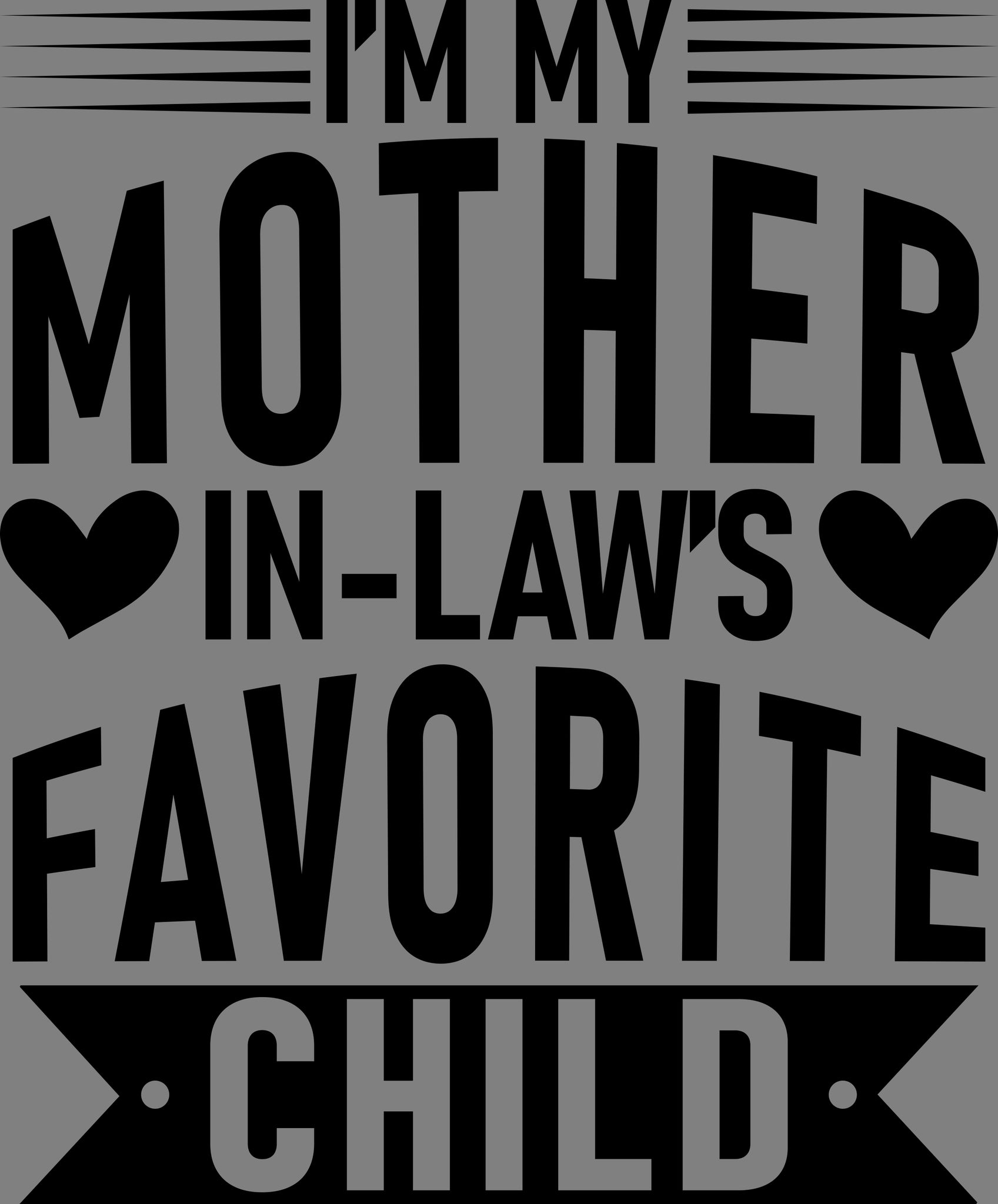 I'm My Mother In Law's Favorite Child DTF Transfer – 10.6" wide design for t-shirts, hoodies, tote bags, and more. Vibrant artwork in elegant script with Black or White ink options to match any garment color. Durable, long-lasting transfer perfect for personalized gifts and retail apparel.